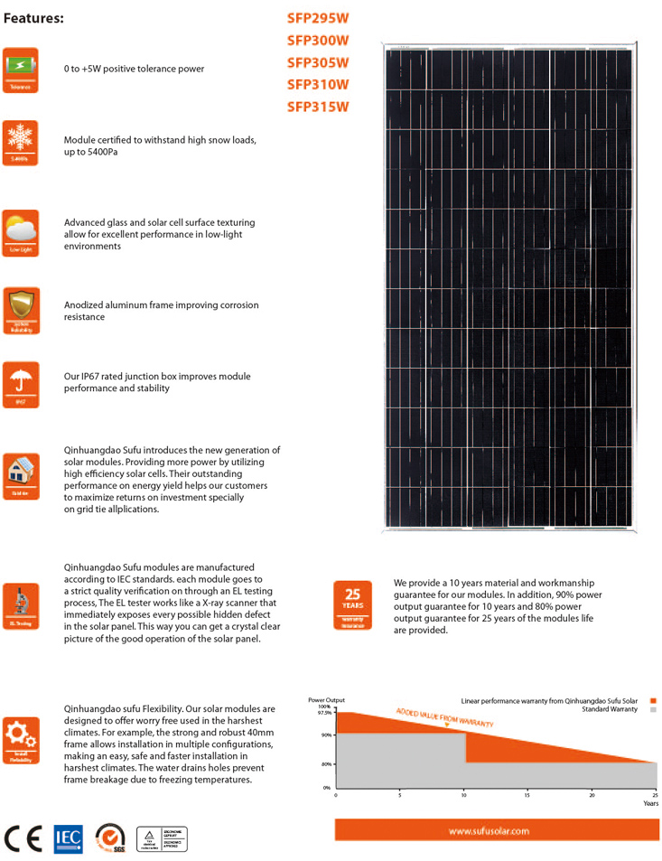 SUFU High Efficiency 72 Solar Cells SFP295W-315W