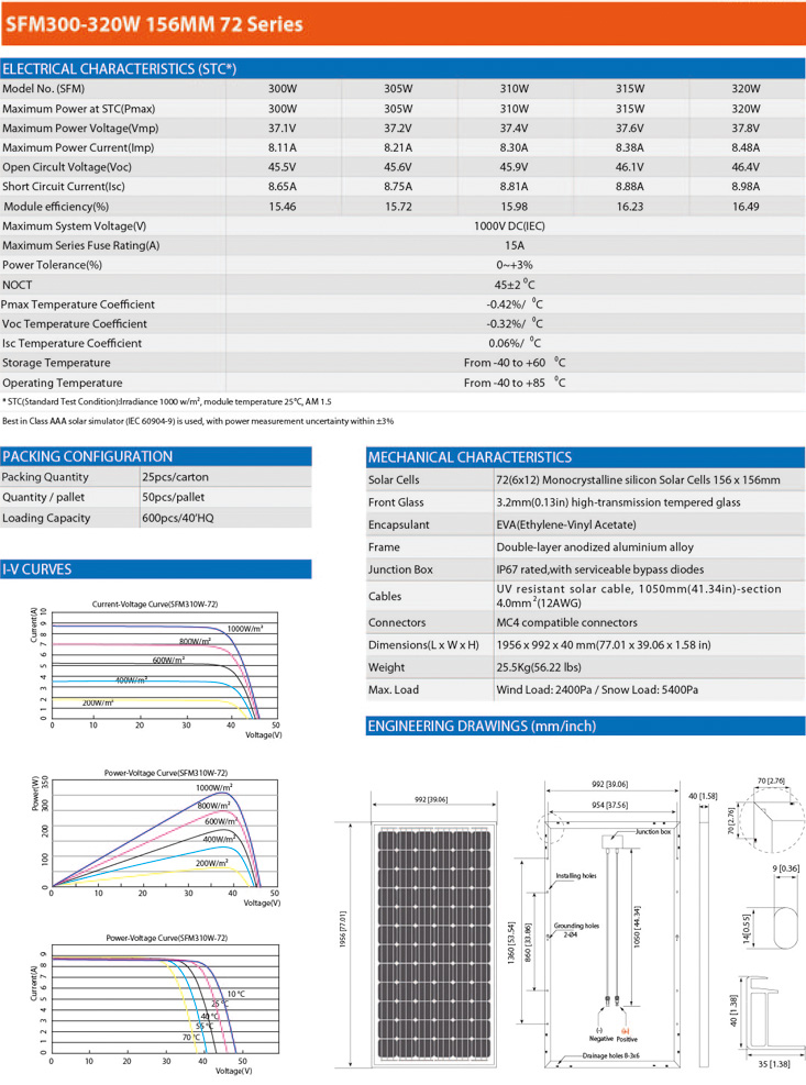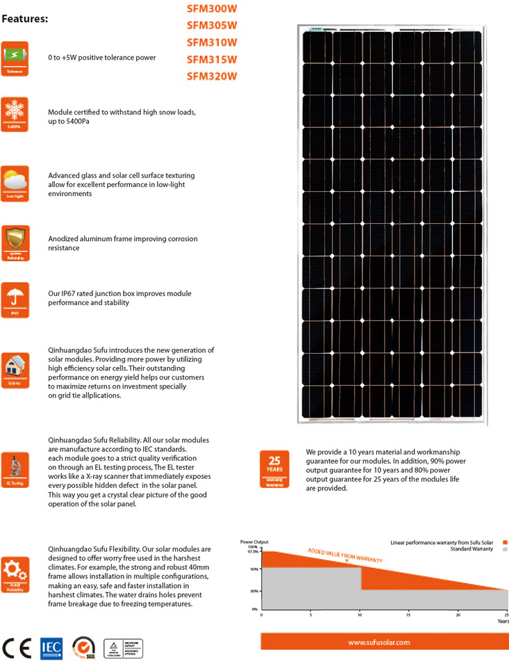 SUFU High Efficiency 72 Solar Cells SFM300W-320W