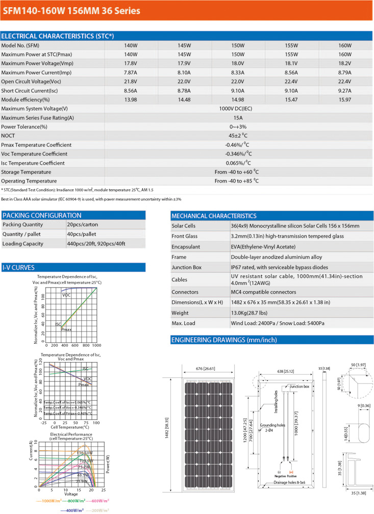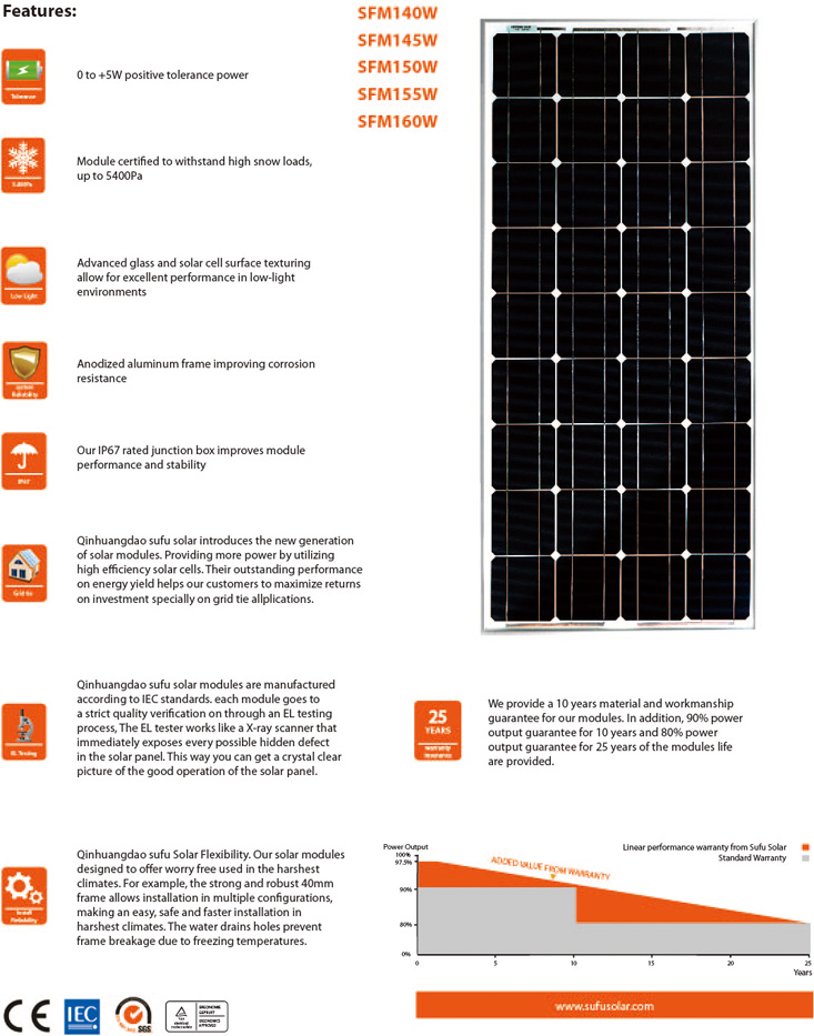 SUFU High Efficiency 36 Solar Cells SFM140W-160W